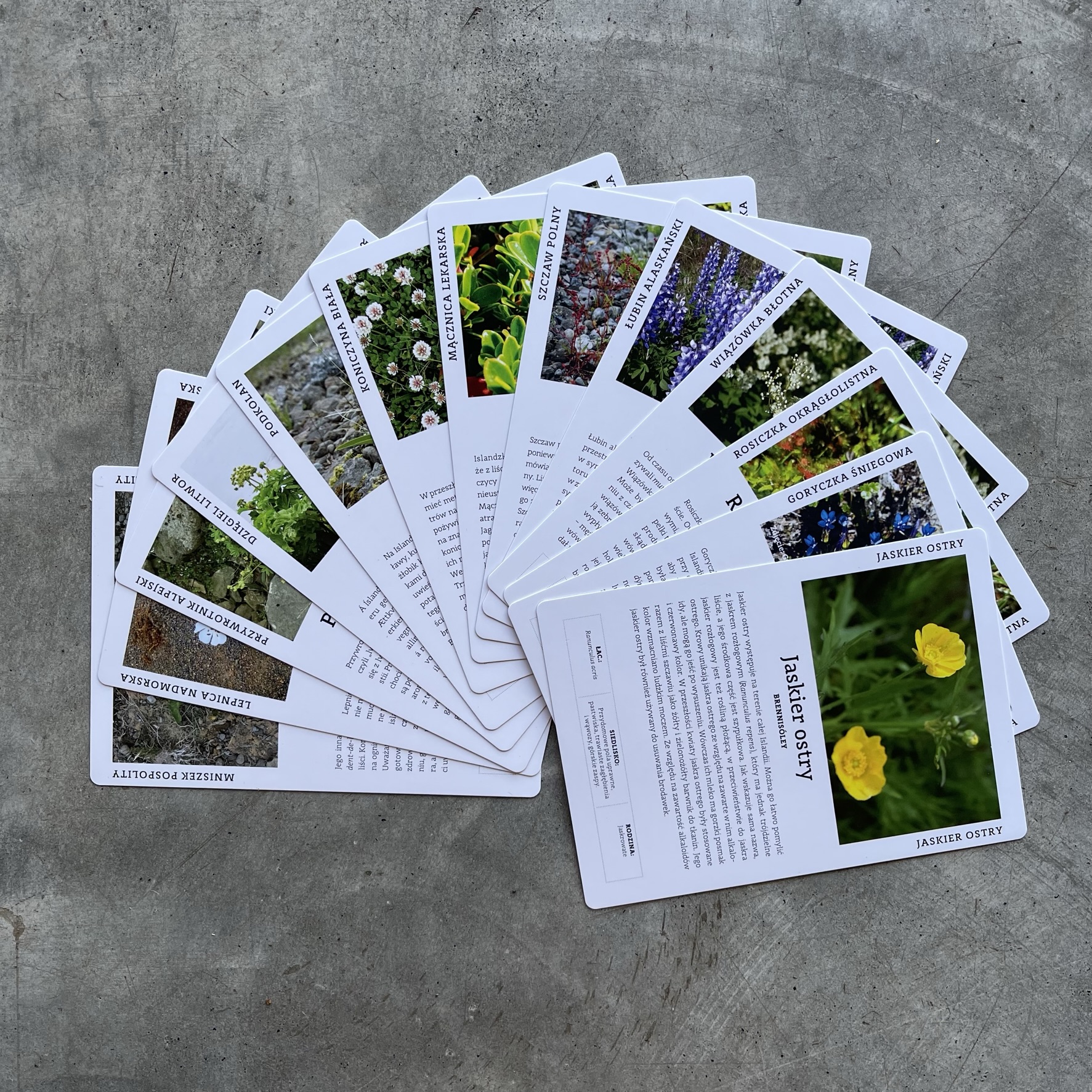 Opakowanie zawiera 52 karty przedstawiające 13 gatunków islandzkich roślin oraz zasady gry