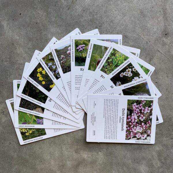 Karty zawierają informacje na temat tradycyjnego wykorzystania roślin, ludowych legend, ich nazw naukowych,