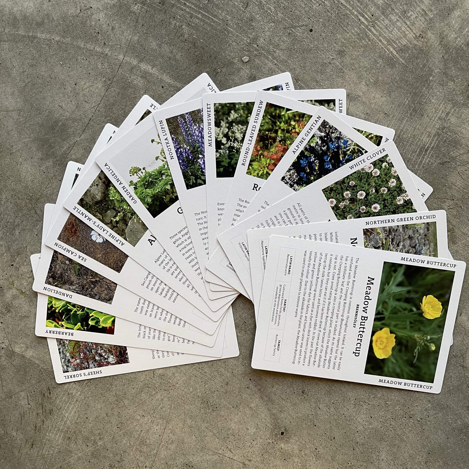 Flóruspilið á ensku. Spilið er í anda spilsins “veiðimaður” þar sem markmiðið er að safna fjögurra spila samstæðum en í stað hefðbundinna spila þá er spilað með íslenskar plöntutegundir. Á spilunum eru upplýsingar um grasnytjar og þjóðtrú ásamt latínuheiti, gróðurlendi og ætt. Spilið er hugsað til fróðleiks og skemmtunar. Tegundaheitið kemur einnig fyrir á íslensku. Flóruspilið annar stokkur er sjálfstætt framhald fyrsta stokks en hér eru 13 nýjar tegundir til að spila með og fræðast um.